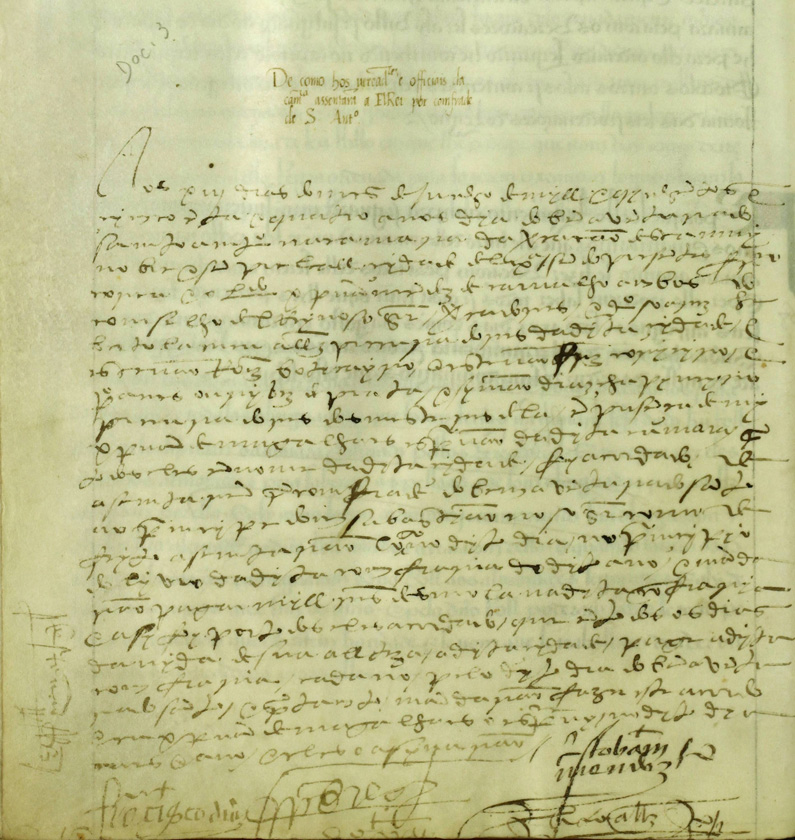 De como hos vereadores e officiais da Camara assentaram a el-rey por confrade de Santo Antonio Aos XIII dias do mes de Junho de mill e quinhentos e cincoenta e quatro anos dia do bem-aventurado Santo Antonio na camara da vereacão desta muy nobre e sempre leall çidade de Lixboa sendo presentes Francisco Corea e o licenciado Crisptovam Mendez de Carvalho ambos do comselho d´el-rey noso senhor vereadores e Diogo Soarez e Bartolameu Allvarez procuradores da dita çidade e Estevão Roiz botecayro, e Estevam Fernandez corryeyro e Pero Anes ouryvez de prata e Symão Diaz carpinteyro procuradores dos mesteres dela em presença de mym Crisptovam de Magalhães escripvam da dita Camara por todos eles em nome da dita çidade foy acordado e asentaram por comfrade do bem-aventurado santo ao princype Dom Sabastião noso senhor como de feyto asemtarão logo no dito dia no princypio do lyvro da dita confraria do dito ano e mandarão pagar myll reis de esmola na dita comfrarya e asy foy por todos eles acordado que em todos os dias da vyda de Sua Allteza a dita çydade pague a dita comfraria cad´ano pelo dito dia do bem-aventurado santo e per tamto mandarão fazer este asento e eu Crisptovam Magalhães o escripvy no dito dia mes e ano e eles o asynarão
